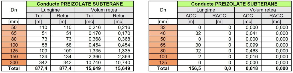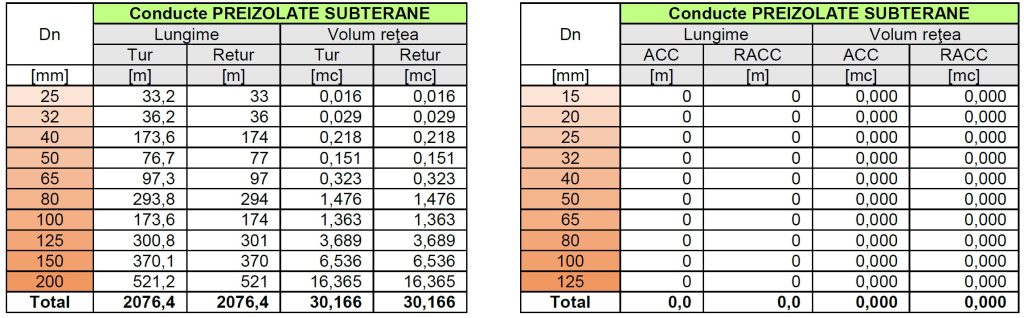 Rețelele de distribuție au următoarele lungimi ale traseelor, respectiv lungimi totale ale conductelor tur-retur, prezentate în tabelele de mai jos. Nu există rețele pentru recircularea apei calde de consum.